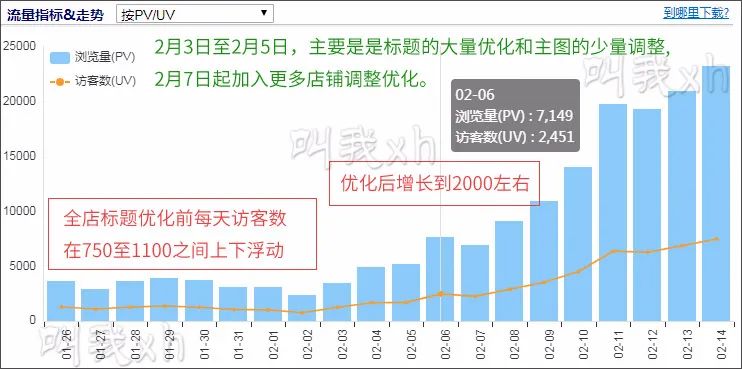 先说一下最近操作的一个店铺,在进行标题优化前,每天访客在750到1100之间上下浮动,优化后,几天时间访客数增长到2000左右,前面几天主要是针对全店宝贝的标题进行了调整优化,主图只是微调,效果已经非常明显。
