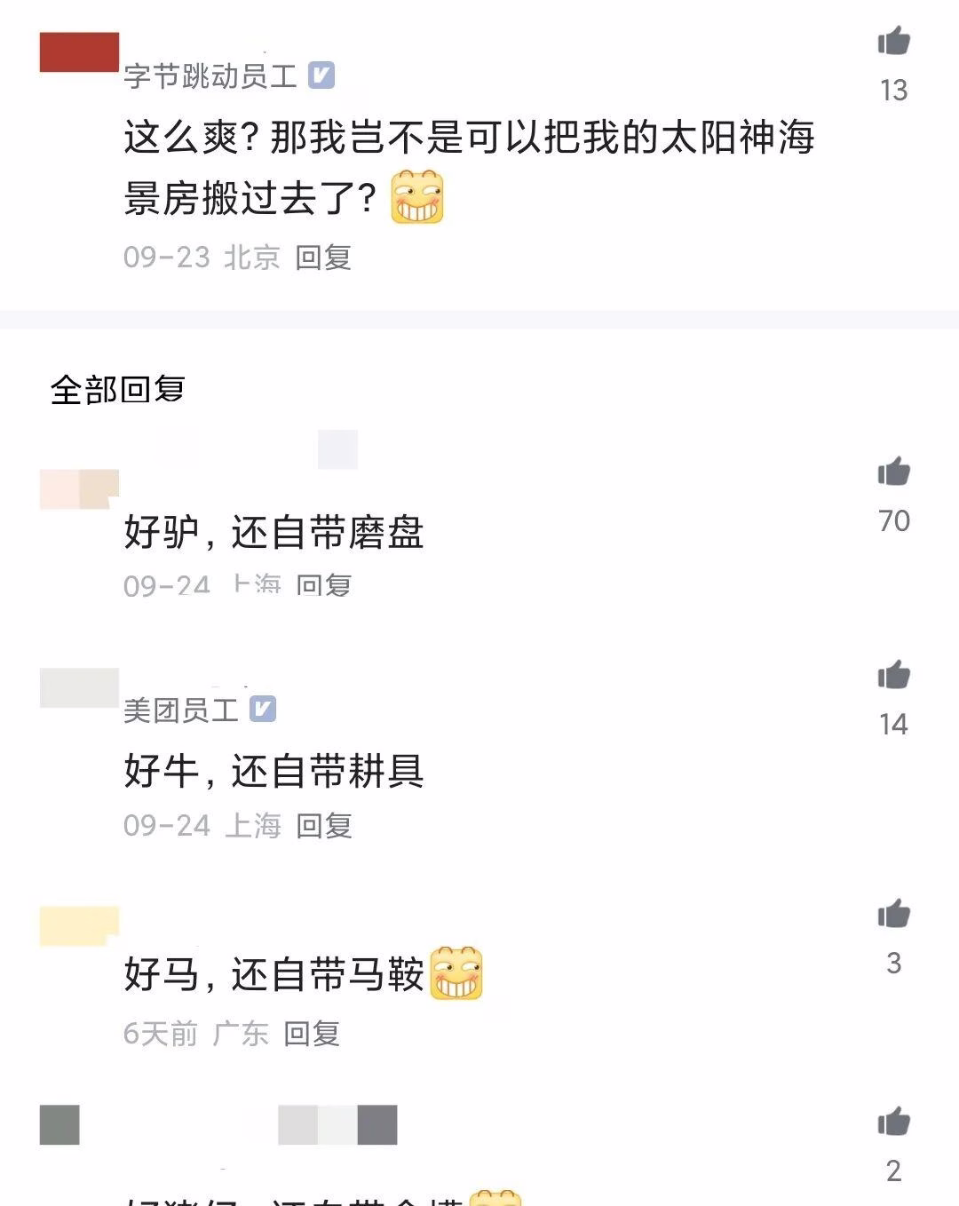 有网友评论:“真好,我可以带自己的太阳神海景房了。”还有人调侃道:“好牛,居然还自带耕具;好驴,居然还自带磨盘;好马,居然还自带马鞍。”