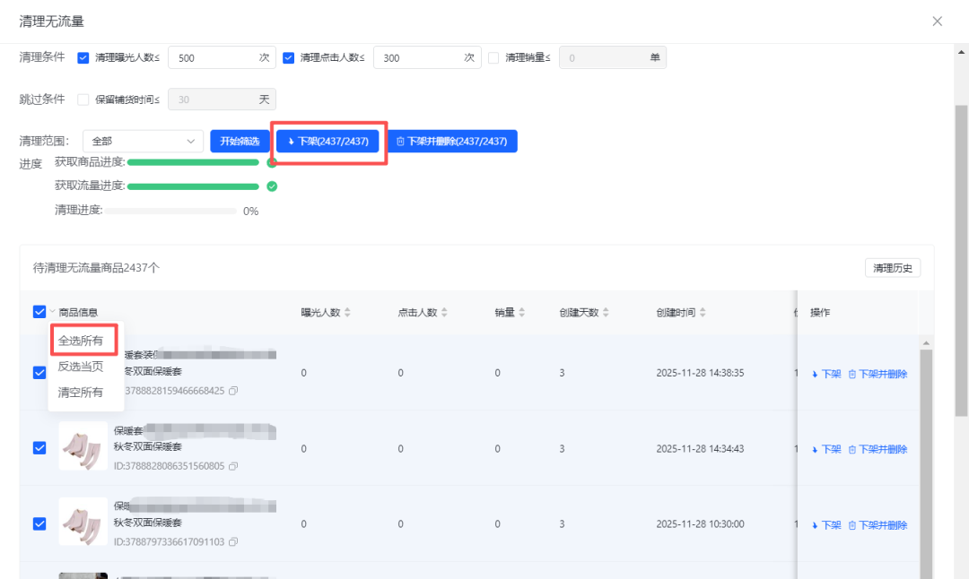 完成设置后,符合条件的商品就会出现在列表中。你可以全选这些商品,然后点击“一键下架”按钮。这样,积压已久的物流量产品就轻松清理完毕了!
