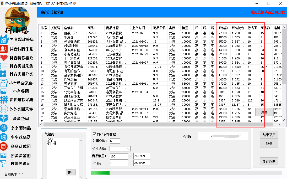 一天可以采集几十万品、还有独创开发的新品采集 拼多多(待成团、评论数、上货时间)等众多优秀功能。