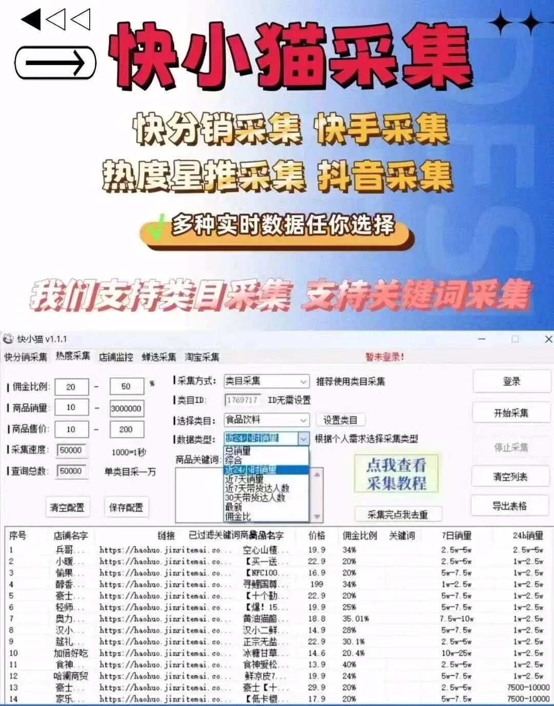 而快小猫就像是一个全能的"数据猎手",它能够同时覆盖快手、抖音、快分销三大主流电商平台,实现数据互通共享。通过独特的“三核采集系统”,只需要一键操作,就能轻松获取短视频带货榜、直播爆品库等核心数据。