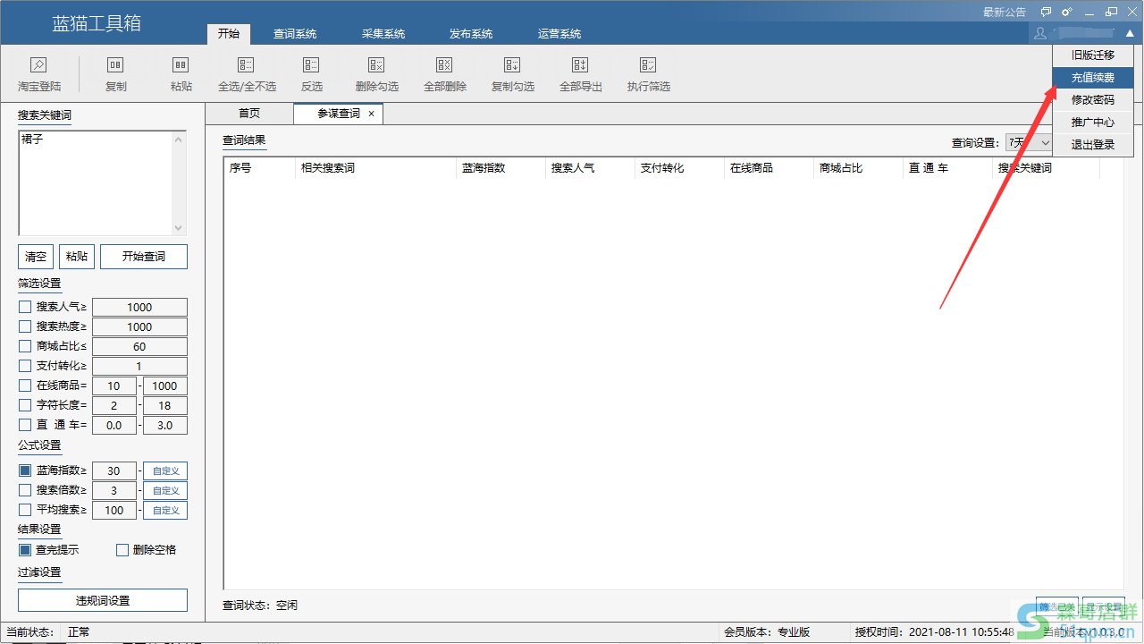 1、打开蓝猫工具箱,找到【参谋查词】专业版(79金币/月),点击开通,输入所购买的卡密,进行充值即可。