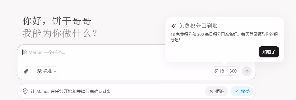 - Manus开放注册! 那个火爆的AI Agent工具Manus终于不用邀请码了,注册就送积分,但每天的免费额度可能只够“浅尝辄止”,估计就一天一次,复杂任务还跑不完。