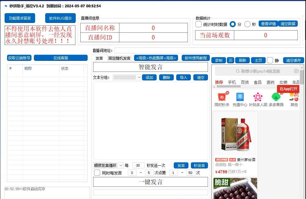 秒拼助手是一款专门针对拼多多直播间的场控助手软件,它能够帮助用户提前设置直播间互动、发言内容、指定发言,急速发言,发言频率等功能。通过秒拼助手,你可以轻松营造出直播间人气火爆的效果,提升真实客户的停留时间。