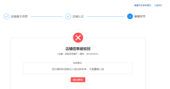 最近很多人入驻拼多多店铺,都出现拼多多重复入驻驳回
