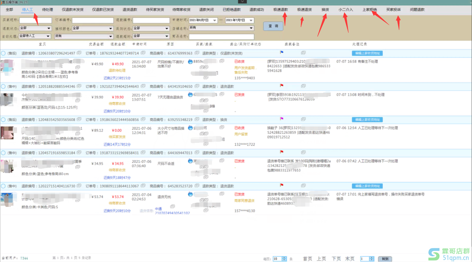 6.第一次使用的可以在下面截图的地方筛选到看看,用过下单软件的一般都可以直接上手,** 一般只处理待人工的几个就行了,其他等待软件自动处理即可**