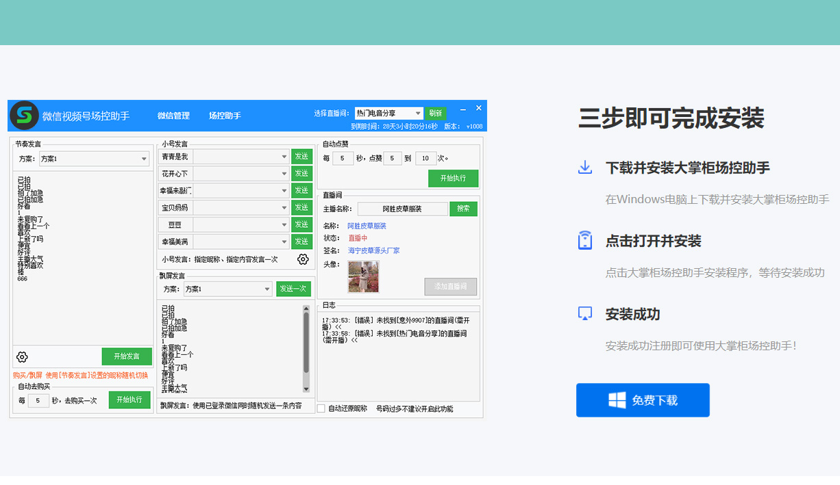 一款专业的直播间发言互动场控系统,通过 一个或者多个微信号模拟无数个用户在直播间发言的互动场控系统.可提前设置直播间互动昵称、发言内容、指定发言,急速发言,发言频率、自动点赞,自动购买等功能。