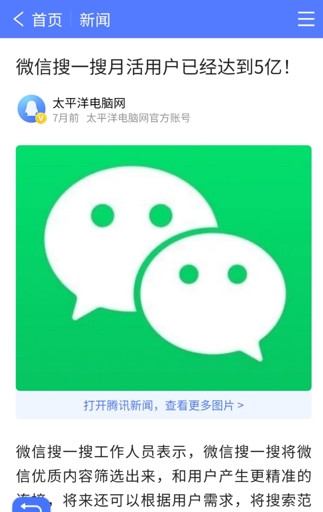 通过上面图片可以知道,搜一搜可以搜索朋友圈、文章、公众号和小程序等的内容。朋友圈搜索有局限,不是好友的搜索不到,小程序暂时不考虑,所以可以在搜一搜里面展现的还有文章和公众号。