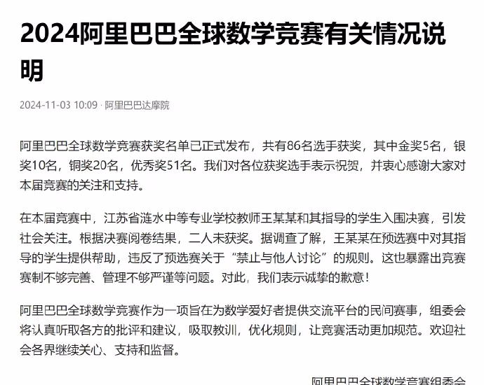 没过多久,阿里巴巴达摩院发了一条消息,说之前预选赛引起大热讨论的中专生姜萍,决赛并未获奖。经调查,预选赛姜萍预选赛能进,是由于指导老师提供了帮助,违反了预选赛“禁止与他人讨论”的规则。