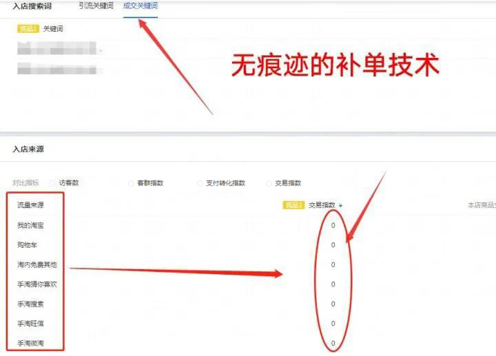 无痕补单的关键就是可以显示成交关键词,但是成交来源里面却什么都没有,没有痕迹,即使通过生意参谋流量路径、访客人数等数据都无法显示,如图所示: