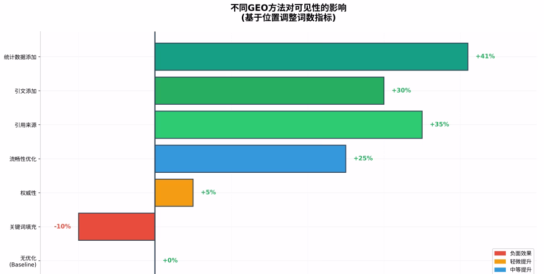 - 关键词填充:传统SEO的核心手段,在GEO中几乎没有效果,甚至会降低可见性。这个结果让我震惊:我们一直依赖的优化手段,在新范式下不仅无效,还可能有害。
