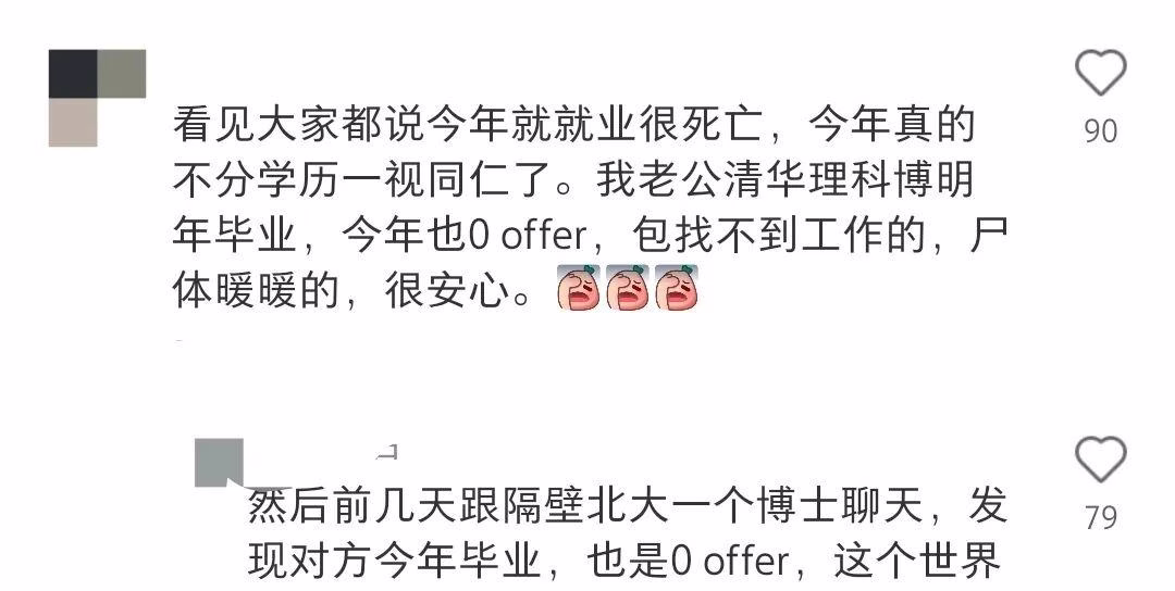 “羊毛月”事件中,也有不少网友分享了自己找工作的艰辛过程。比如,14年毕业的时候,投简历就能直接进去,根本不用实习经验和多轮面试,现在哪怕电子信息这种理工科专业都找不到工作,清华北大的都是0offer……
