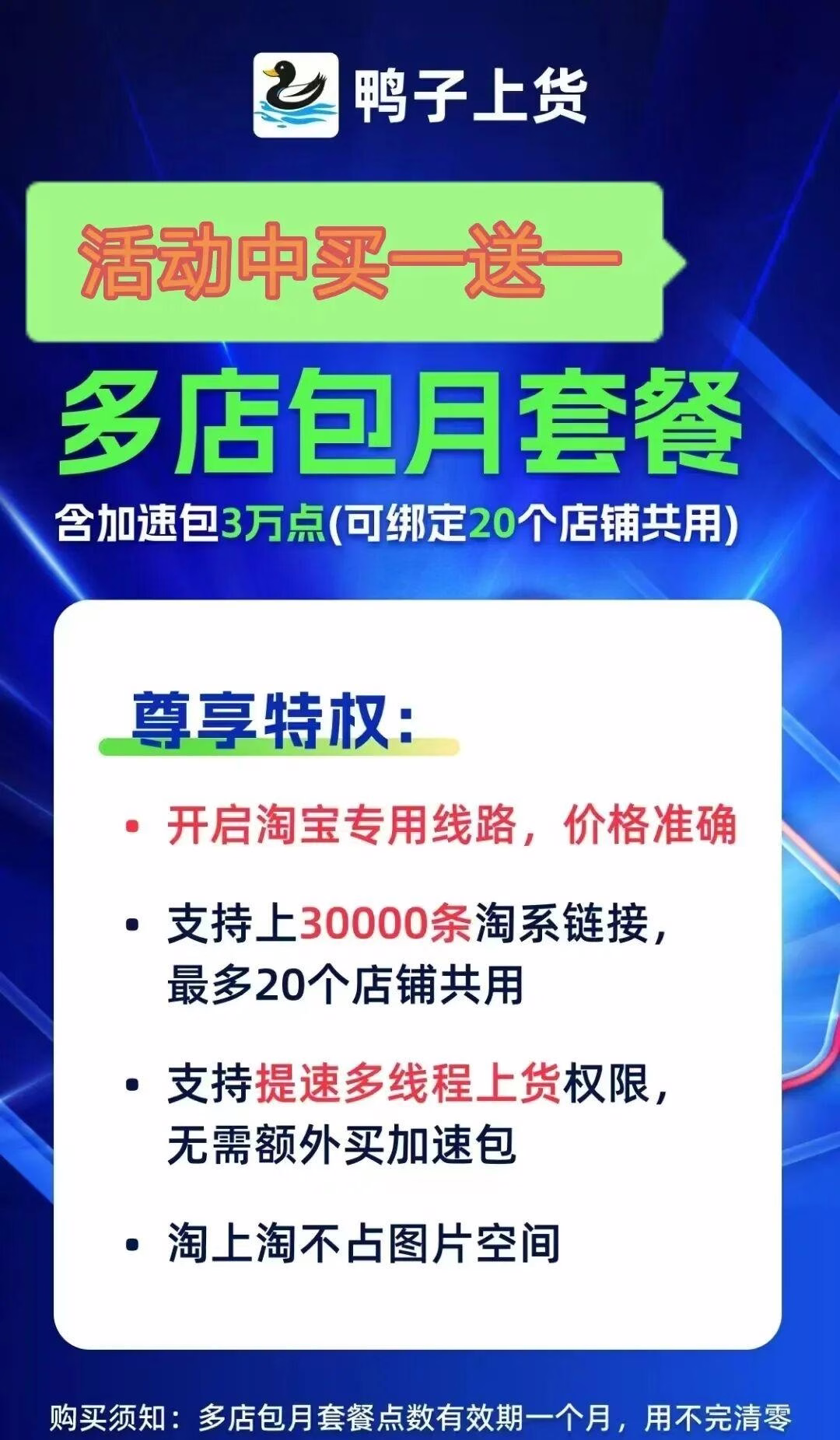 套餐一:月卡到账3000点,叠加使用两个月。 这意味着你可以在这两个月里享受双倍的优惠力度! 套餐二:复制包到账3000点,有效期长达一年。 长期使用的卖家福音来啦! 套餐三:数量包到账4000点,支持长期使用。 如果你是需要稳定货源的卖家,这个套餐绝对是个好选择! 套餐四:整店月卡,轻松享受两个月优惠。 整个店铺都能享受到超值折扣,省心又省钱! 套餐五:多店包月套餐,60000点到账,两个月有效。 如果你管理多个店铺,这个套餐简直就是为你量身定制的!